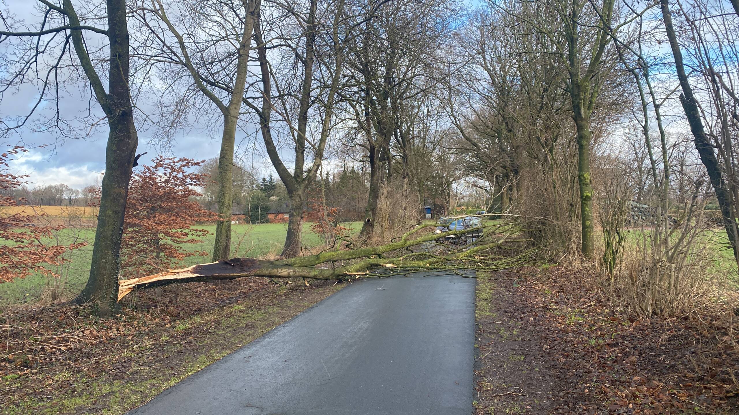 Durch Sturmböen spaltete sich ein Baum und versperrte die Straße Am Bokel. Die Feuerwehr Südlohne beseitigte den Baum von der Fahrbahn. Die Fällung des restlichen Baumes übernahm der Bauhof der Stadt Lohne.