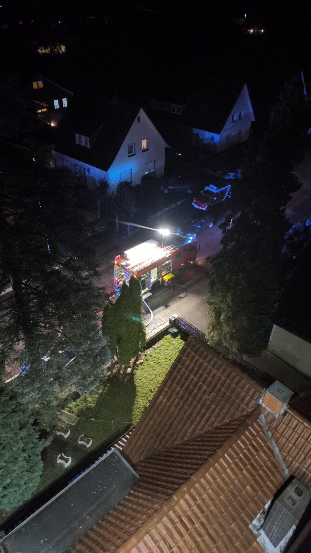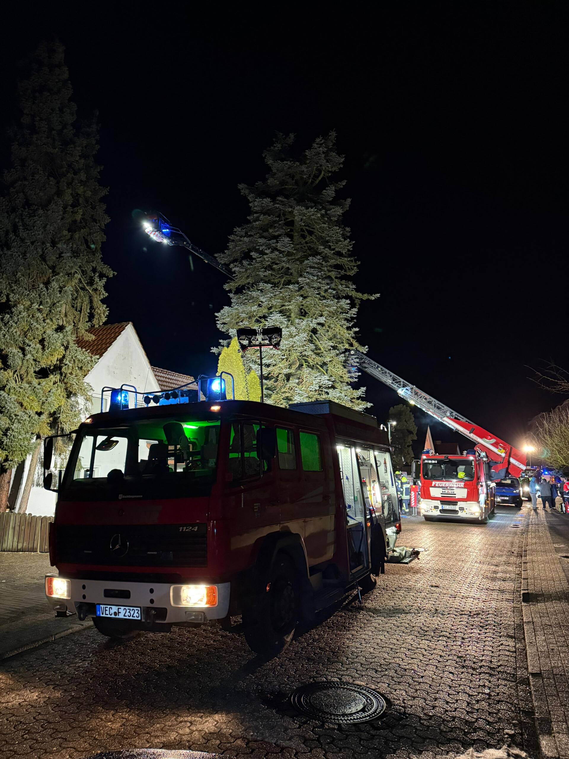 Zur Ausleuchtung der Einsatzstelle kam die Drehleiter zum Einsatz. Sie wurde ausschließlich zur Beleuchtung genutzt, nicht zur Brandbekämpfung.