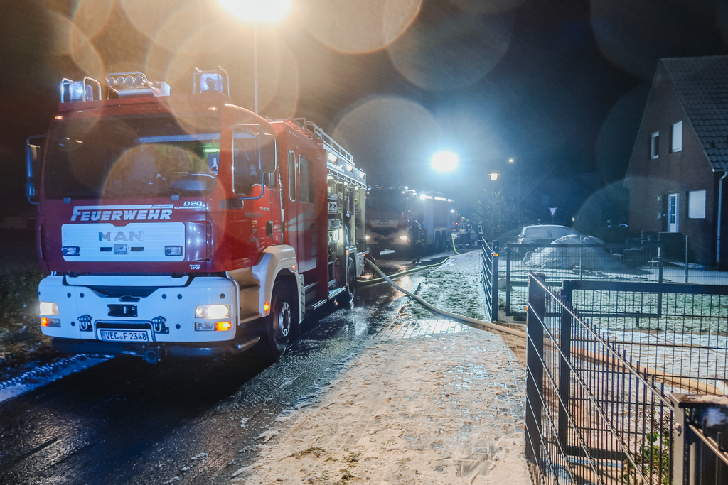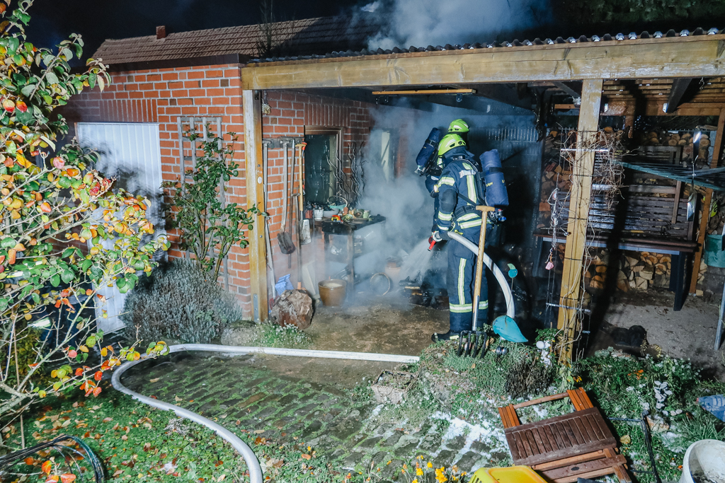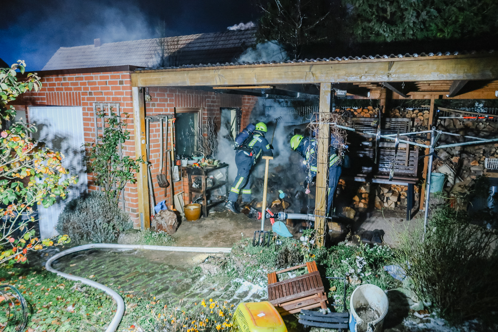 Am Sonntagabend (23. November) wurde die Feuerwehr Lohne zu einem Brandeinsatz auf den Voßberg alarmiert. Gegen 21 Uhr war an der Reinekestraße ein Feuer in einem Schuppen ausgebrochen. Nach ersten Erkenntnissen geriet dort durch unsachgemäß abgestellte Asche ein Anbau an einer Garage in Brand, in dem Kaminholz gelagert war. Die Flammen breiteten sich rasch aus und erfassten zudem eine angrenzende Tanne auf dem Nachbargrundstück.