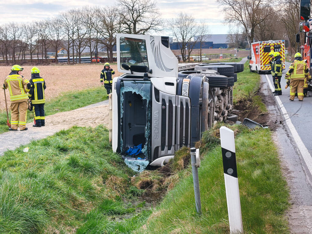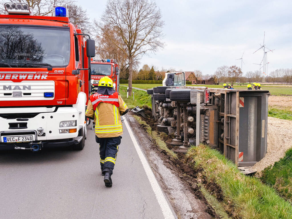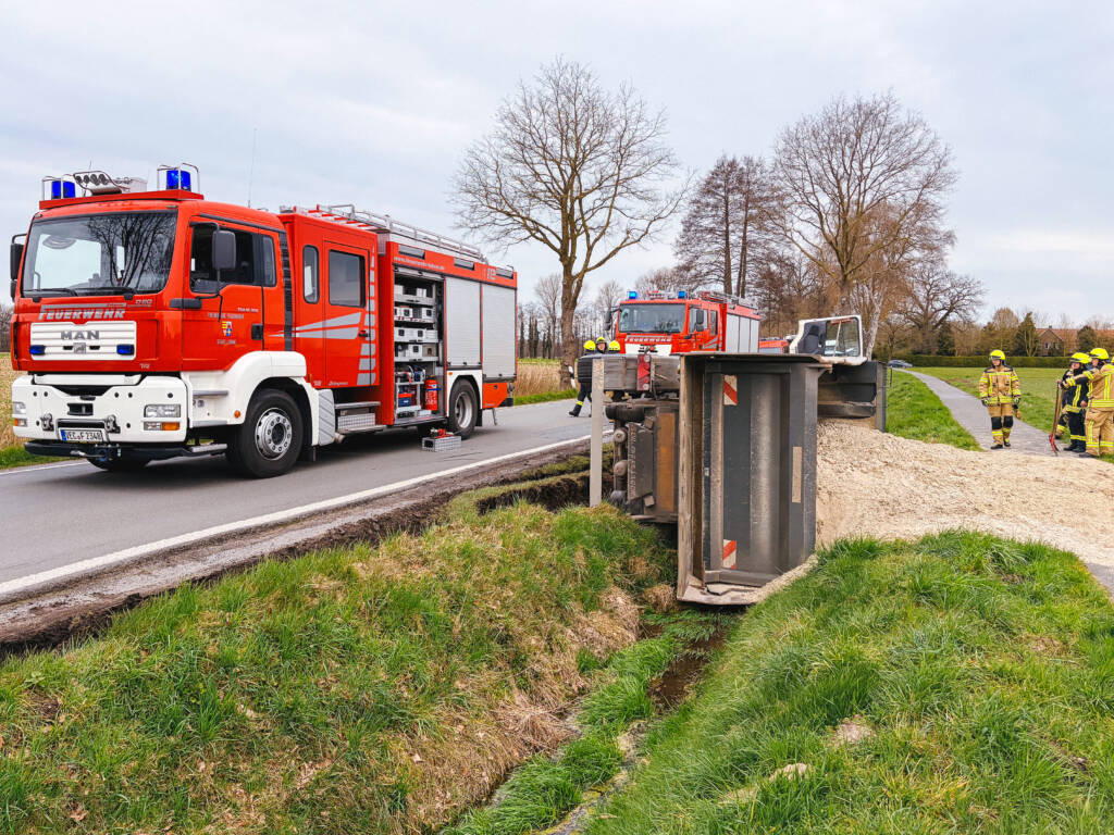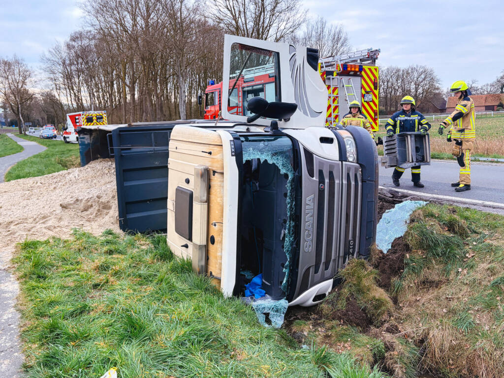 Am Donnerstagmorgen (2. April) ist es auf der Krimpenforter Straße zu einem Verkehrsunfall mit einem Lastwagen gekommen. Ein mit Sand beladener Lkw war aus bislang ungeklärter Ursache von der Fahrbahn abgekommen und in einen Graben gerutscht.